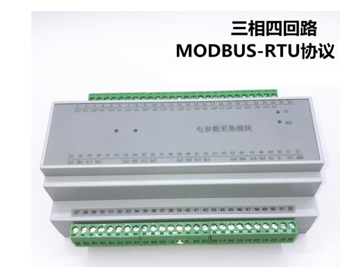 该模块是一智能型电参数采集模块,可测量三相四回路电路中的电压、电流、功率,功率因数、有功电能等,模块具有RS-485通讯接口,MODBUS-RTU协议,模块广泛应用于单相多回路电力参数监测。